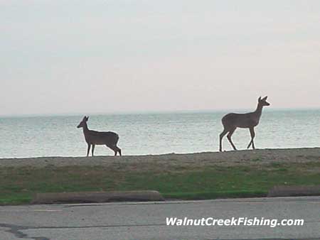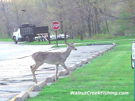 | When I came into the marina this morning I found my first visitors of the day. They just stood there and didn't move much at all. I got eight pictures off them in all before they took off into the woods. There is more to nature than fish. This just proves that Walnut Creek is an ideal place to visit. Even the wild creatures come to check out the lake. p>Next weekend is when the office will be open our regular seasonal hours. Saturday also is the first day of Walleye. Let's See you when you get here. Good fishing. |